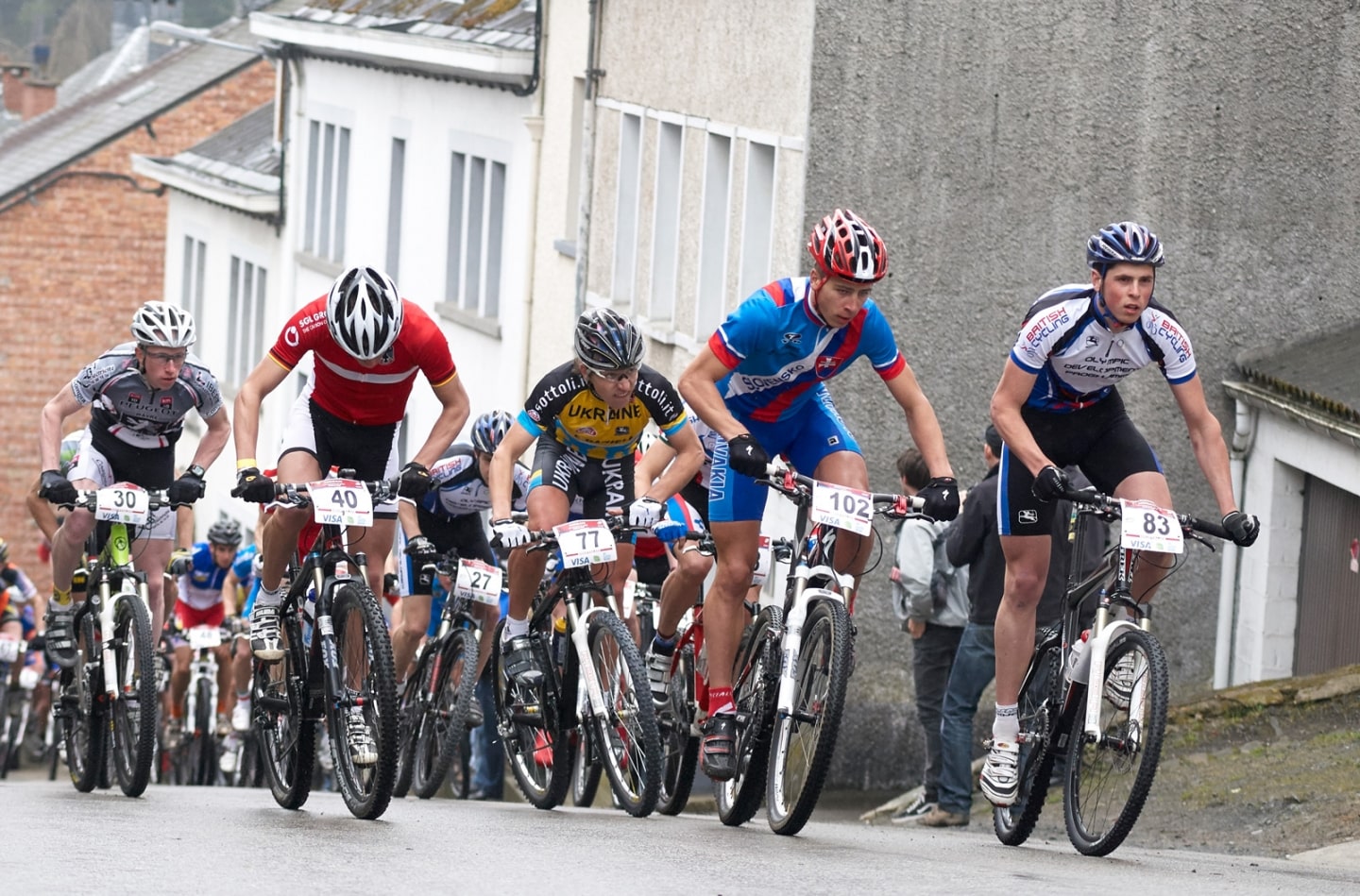 Alex Paton (far right), leading Peter Sagan at the 2008 junior mountain bike world cup in Houffalize, Belgium.