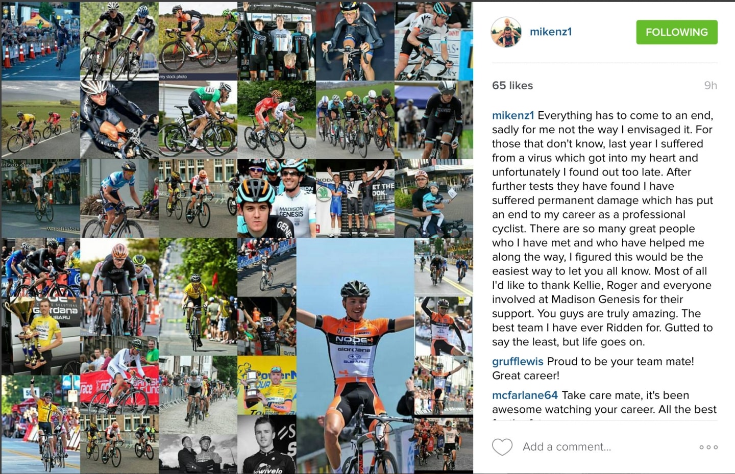 “Most of all I’d like to thank Kellie, Roger and everyone involved at Madison Genesis for their support. You guys are truly amazing. The best team I have ever ridden for. Gutted to say the least, but life goes on.”